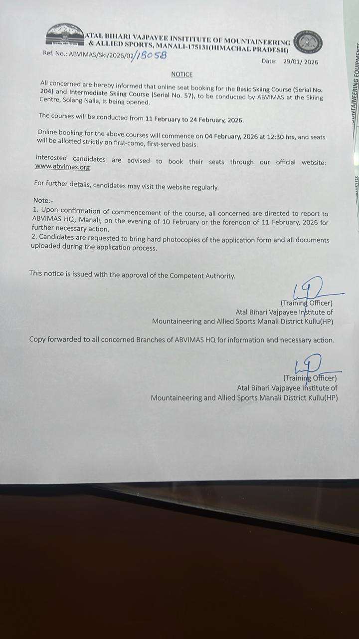 Notice Title :- Booking for Basic & Intermediate Skiing Course [11-02-2026 to 24-02-2026] Will be open on 4th Feb, 2026 at 12:30 PM on our website.